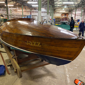 Jazz was one of three of its type designed prior to WWI by Montagu Batting to compete in the Royal Motor Yacht Club's Restricted Class, the rules for which had been announced in 1911. Almost identical, Batting's three boats were constructed on the Thorneycroft hydroplane principal and built under licence by Morgan Giles & May in Hammersmith. Named 'RIP II', 'Pixie II', and 'Batboat I', the boats were owned by, respectively, Mr James Bird, Colonel Cowper-Essex, and Montagu Batting himself. It is not known for certain which one of these three became 'Jazz'.